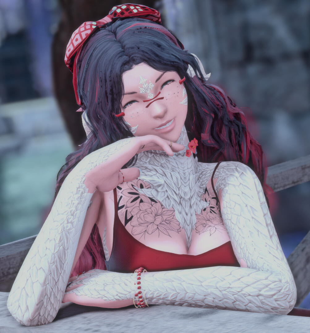 Age: 20Race: Au Ra (Raen Clan)Gender: FemaleSexuality: HeterosexualRelationship Status: TakenHeight: 5’0Eye Color: Heterochromic; Ice Blue(R), Ice Green (L)Hair Color: Dark Brown w/ Red Highlighting✧༺༻✧